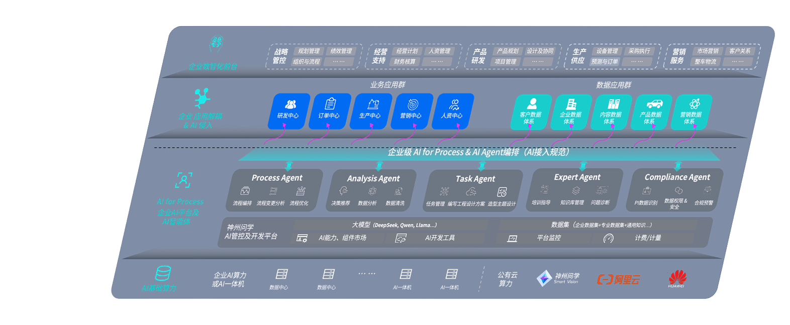 端到端的一站式AI工作空间深度融合了从企业战略规划到日常经营的全流程业务板块,,,定向解决车企内部领域多、、部门多、、、、链条长、、、、场景碎片化等难题,,,,支持车企快速构建以AI为核心的生产力写作体系,,,实现任务执行与AI能力的无缝集成与交互