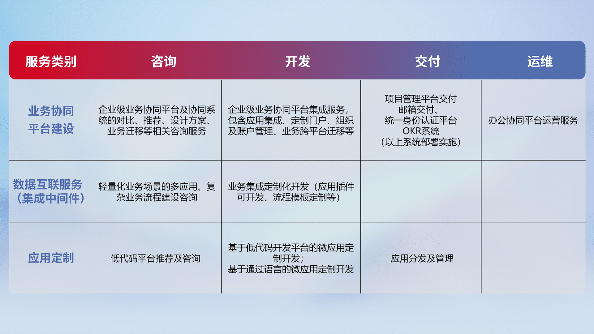 针对钉钉、、企微、、、、IDaas等平台级产品提供产品的规划、、、、方案、、、、交付、、定制化开发等服务,,,实现如统一协同办公、、、、智能客户服务、、混合会议管理、、、、智能数据查询、、等业务场景,,,实现数字化转型。。