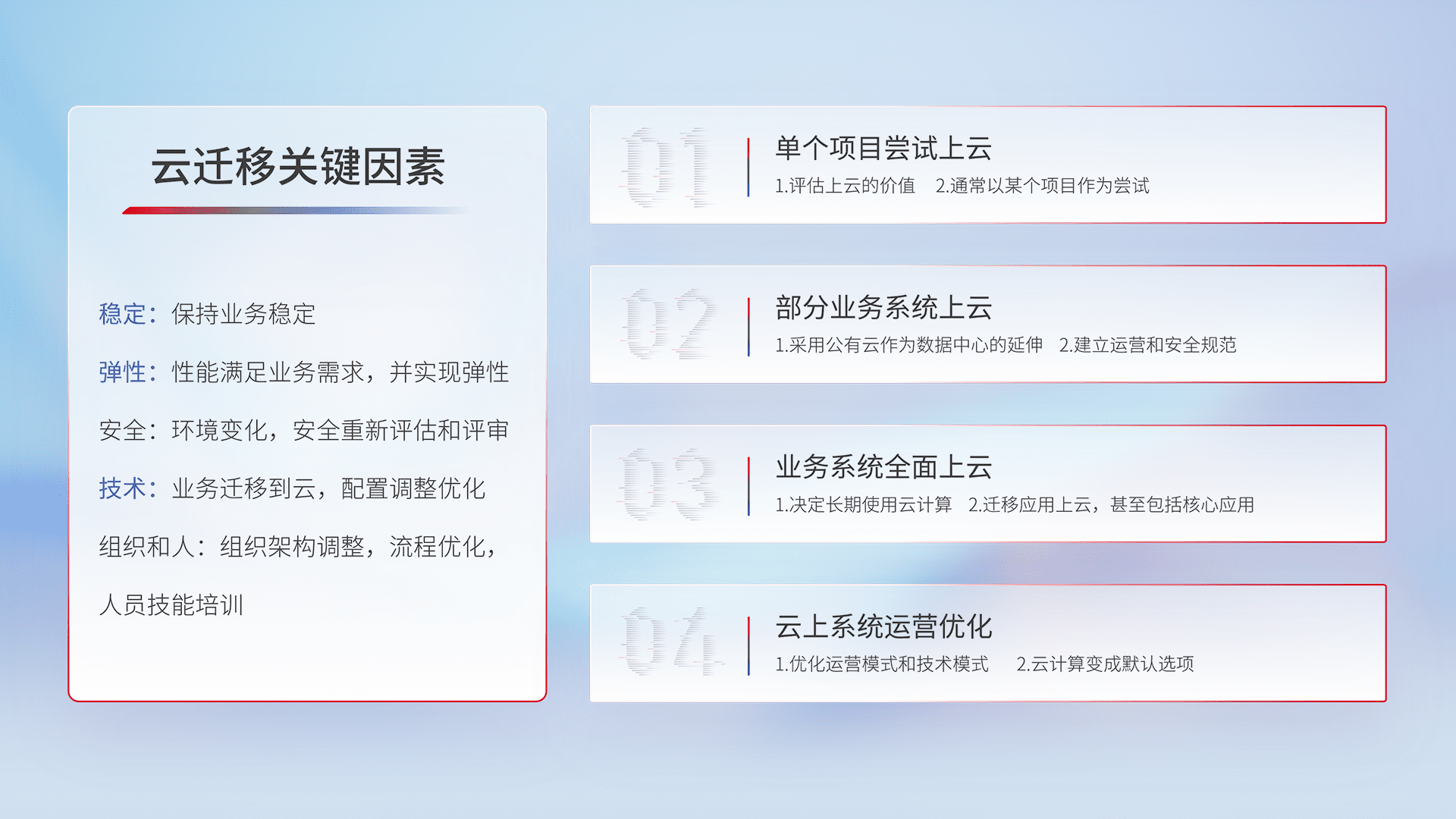 结合实际业务,,,从规划设计、、云平台选型、、、云原生改造、、数据迁移、、、集成交付,,迁移全过程为客户识别最佳上云路径,,,,做好风险识别管理,,设计网络架构、、、、身份权限、、、安全审计合规、、、操作审计、、日志审计、、监控告警策略、、多站点容灾设计等,,,,对云上基础设施进行整体规划,,,提升IT治理水平,,,,以满足弹性、、、、高可用、、高性能的需求。。